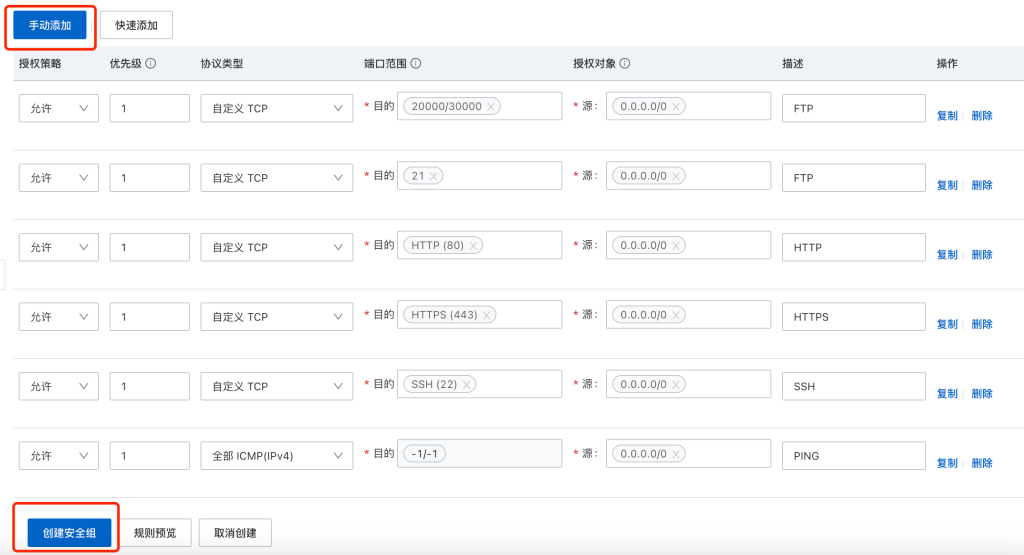 如果你购买的是腾讯云、阿里云等,控制面板中可以找到机器对应的安全组,在这里可以选择放开哪些端口或者协议。常见的可以放开80,443以及一个SSH端口。